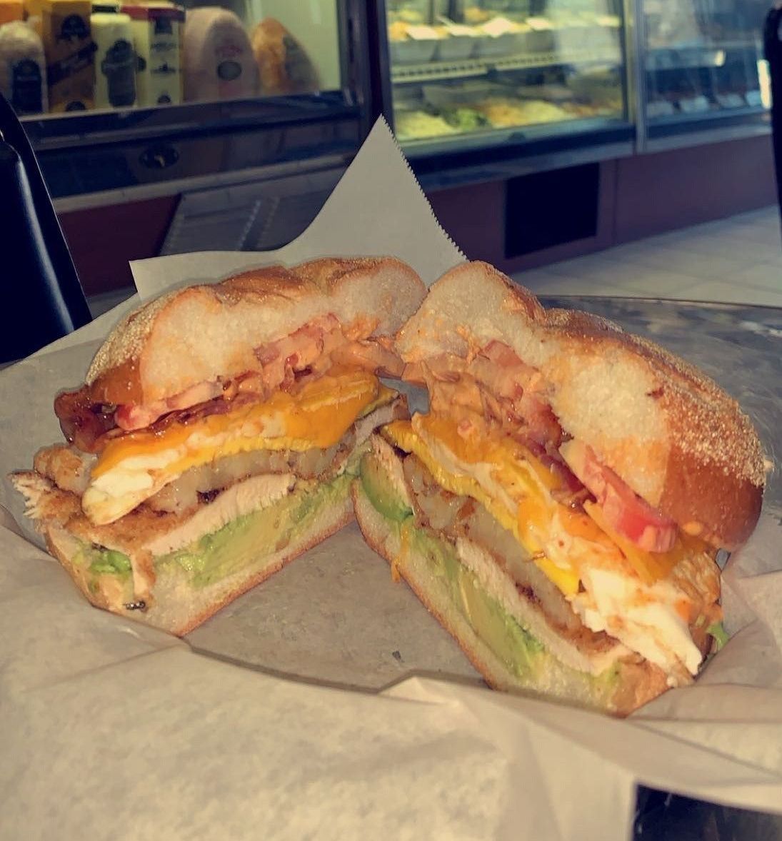 Chicken cutlet, Colby cheese, arugula, tomato, avocado, bacon, and Chipotle mayo